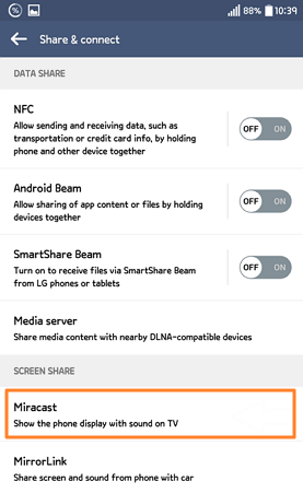 Step 3: On your android phone active the Cast or Screen Sharing option (In other manufactures option may appear as Wireless Display, All Share Cast, Mirror Display or Share and Connect).